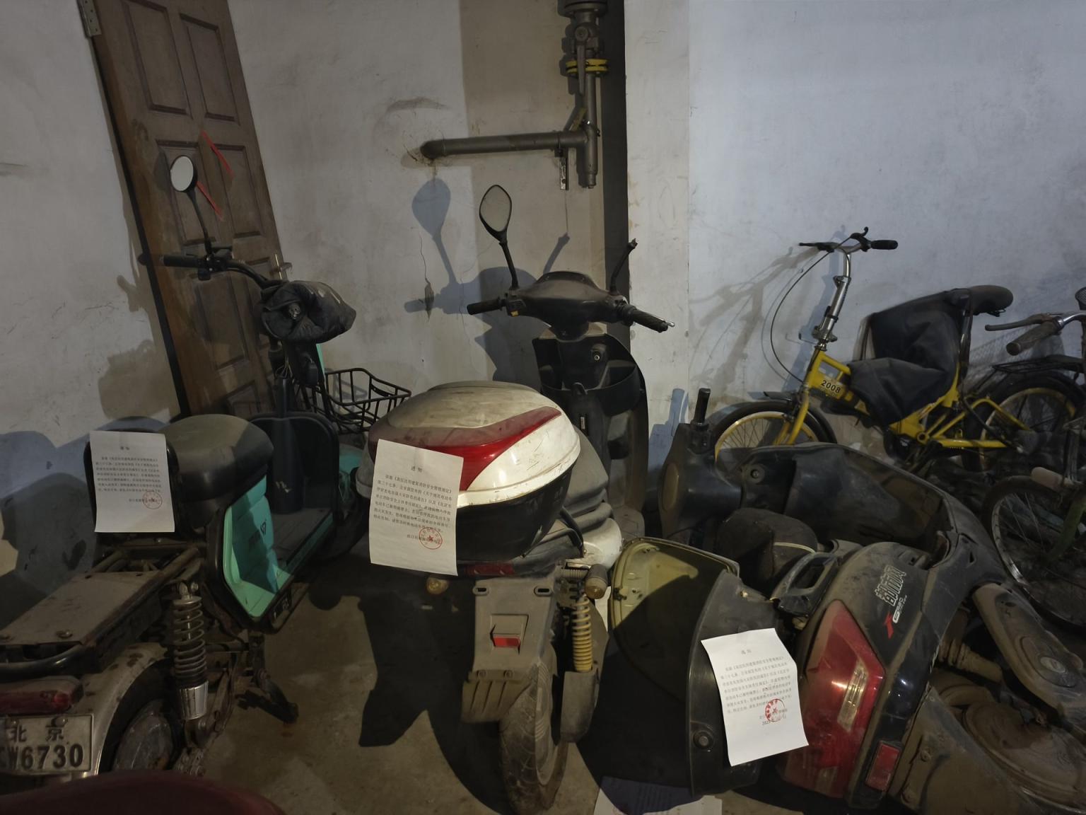 记者走进12号楼地下自行车库,还能看到墙面上残留着十余个充电口被拆的痕迹。这里不仅停着自行车,而且有不少电动自行车,有的车辆已经积满了灰尘,多辆车上都有物业不同时期张贴的挪车通知,但显然收效甚微。