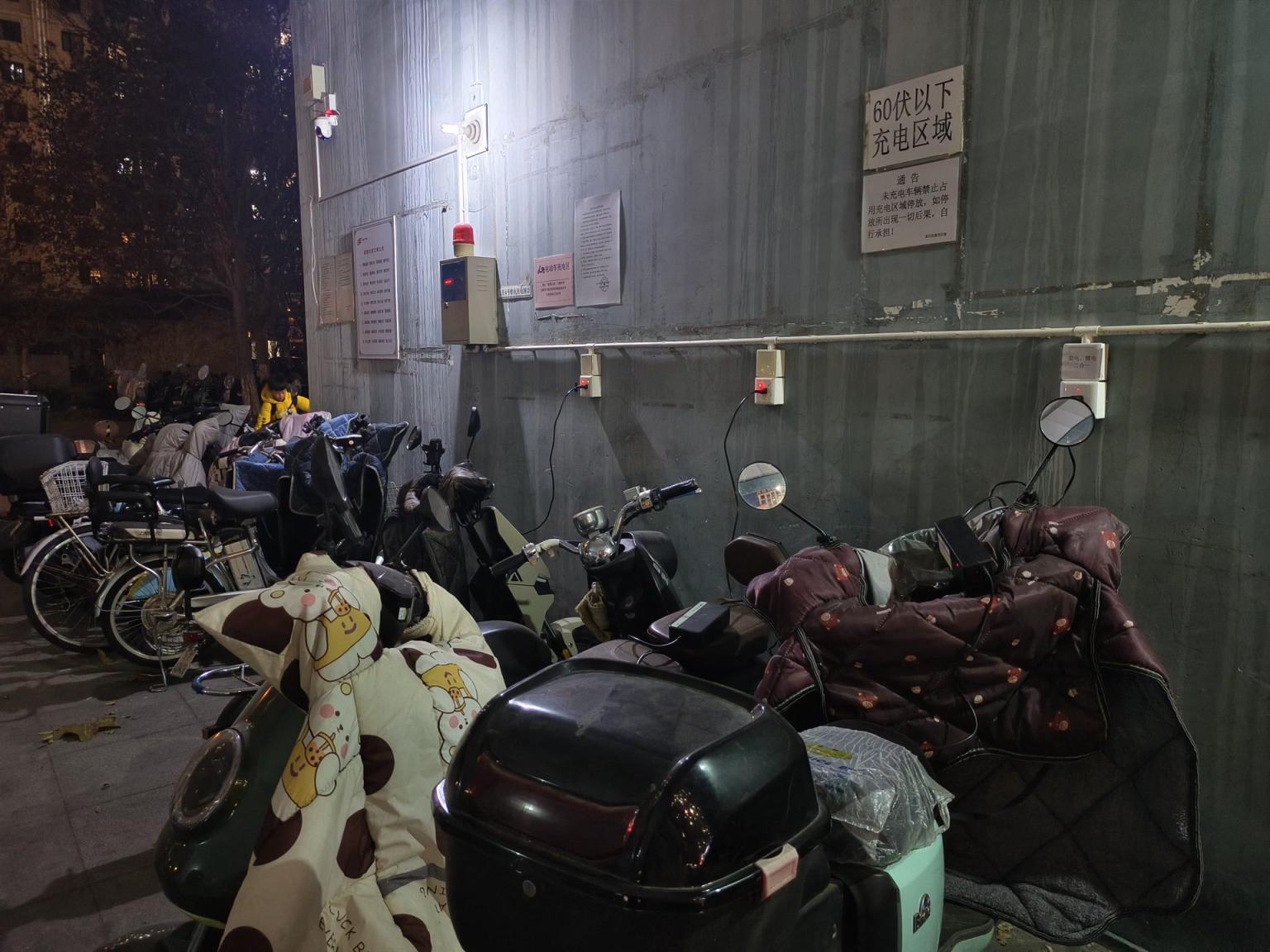 10号楼南侧的充电区共有18个充电口,铁栅栏之外是社区卫生服务站的车棚,那里还装着阻燃板,相较之下,小区内的这个充电区域就简单得多,上方只有一个简易的遮雨棚,但里面停得满满当当。虽然小区内的两处充电区域贴有告知“请勿将正在充电的电动车电源拔掉”,或贴有《电动车充电安全管理规定》,但居民反映,小区目前面临的最大问题是大家的基本充电需求难以满足,管理规定就更难得到执行了。
