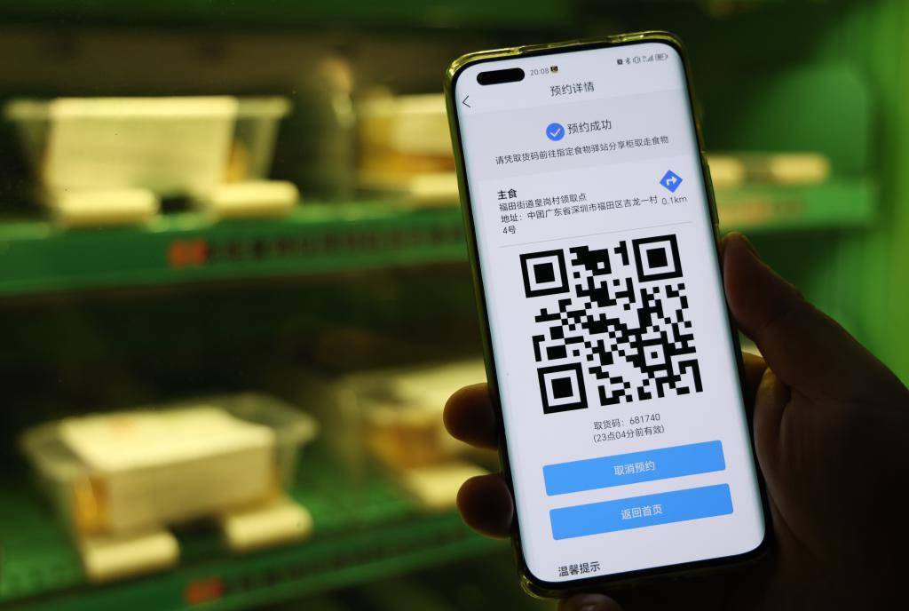 12月20日,在深圳市福田区福田街道皇岗村的“食物银行”,晚上8点后,剩余食品开放给全体居民,一位居民在“i深圳”app上预约成功后,来到智能柜机领取。新华社记者 梁旭 摄